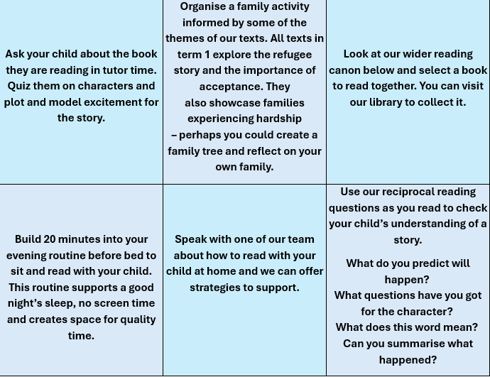 At Future Academies, we value the skill of reading for learning therefore create structured time for students to extend their skill and love of reading as well as improving their wider cultural knowledge of the world around them. Three times a week in tutor time, students are read to, covering three texts across the year.
